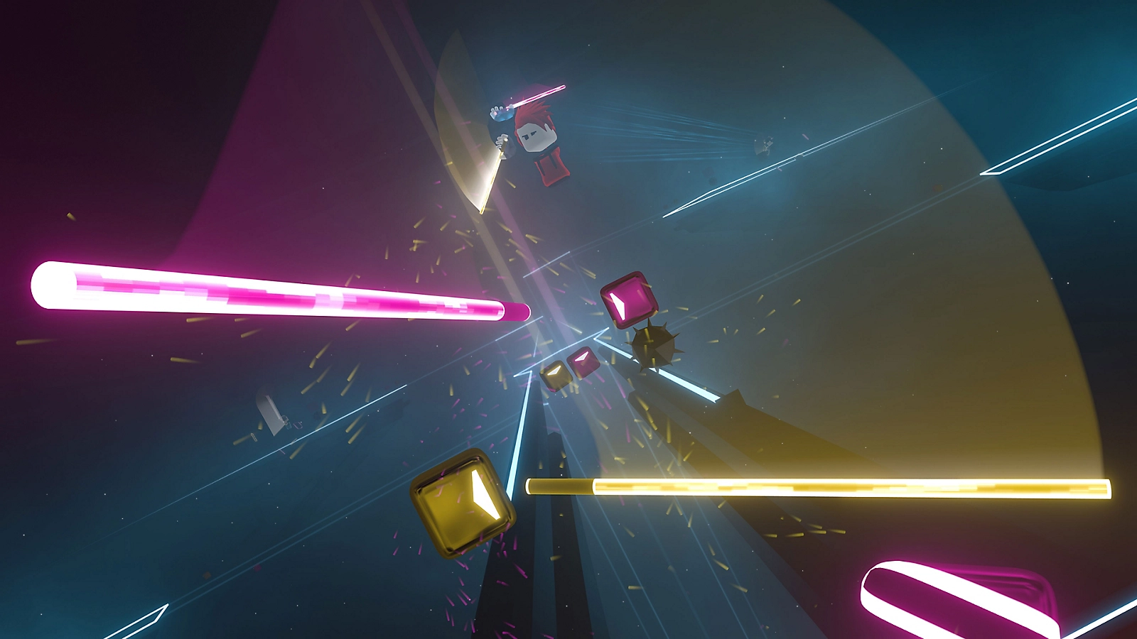 لعبة Beat Saber هي لعبة إيقاع في الواقع الافتراضي، حيث يقطع اللاعبون مكعبات الإيقاع باستخدام السيوف الضوئية، مع مطابقة اتجاه وسيف كل مكعب مع الإيقاع الموسيقي. تدور أحداث اللعبة في عوالم مستقبلیة نيون، حيث يواجه اللاعب تحديات إيقاعية متزايدة الصعوبة. لا يوجد قصة رئيسية في اللعبة، ولكنها تقدم تجربة إيقاعية تفاعلية.