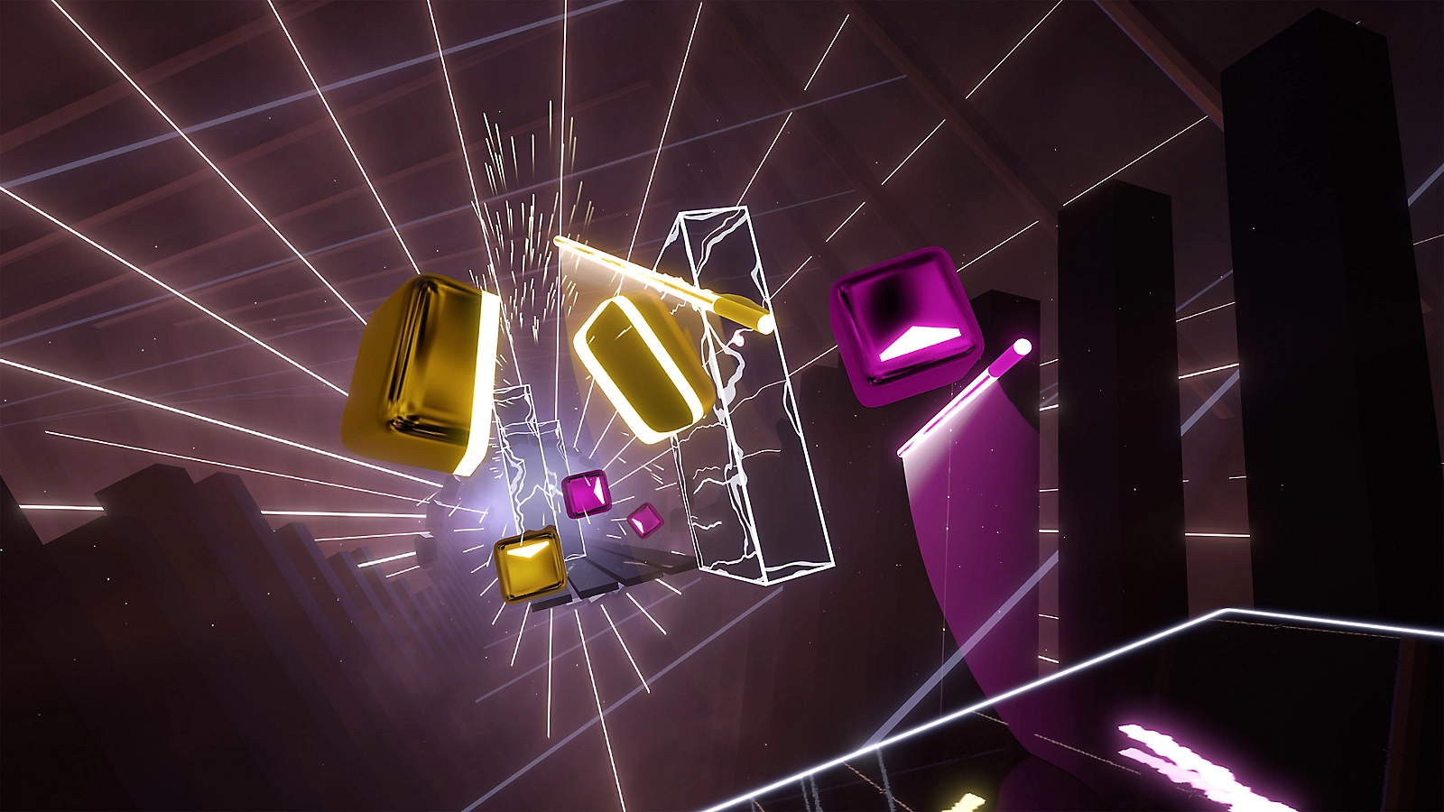 لعبة Beat Saber هي لعبة إيقاع في الواقع الافتراضي، حيث يقطع اللاعبون مكعبات الإيقاع باستخدام السيوف الضوئية، مع مطابقة اتجاه وسيف كل مكعب مع الإيقاع الموسيقي. تدور أحداث اللعبة في عوالم مستقبلیة نيون، حيث يواجه اللاعب تحديات إيقاعية متزايدة الصعوبة. لا يوجد قصة رئيسية في اللعبة، ولكنها تقدم تجربة إيقاعية تفاعلية.
