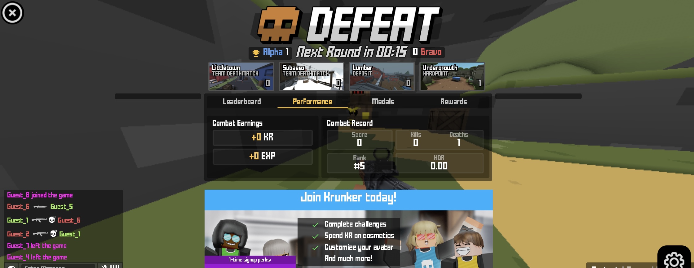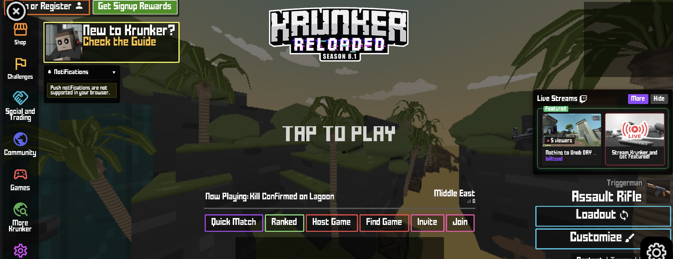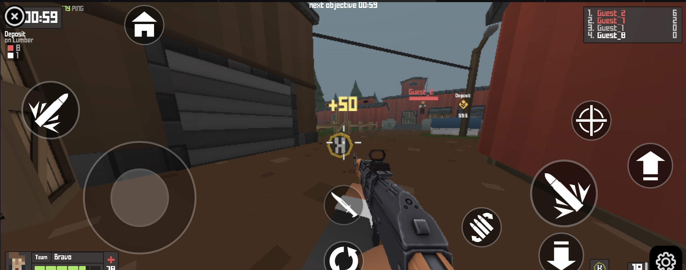 لعبة تصويب جماعية مليئة بالأكشن على نمط .io حيث يمكنك الانضمام إلى عشائر. حاول تصدّر لوائح المتصدرين بالقضاء على لاعبين من جميع أنحاء العالم في Krunker. انضم للعشائر، جرّب أوضاع لعب متنوعة، واستمر بالقتال حتى تصبح رقم واحد. طريقة اللعب: • أزرار WASD للتحرك. • الفأرة للتصويب والإطلاق. • أو استخدم اللمس للتحكم. Krunker.io هي لعبة أكشن أونلاين اخترناها بعناية لموقع Lagged.com، وتُعد من ألعابنا المفضلة على الجوال. فقط اضغط زر التشغيل الكبير لبدء المتعة. وإذا أردت ألعابًا مشابهة، جرّب Kour.io أو Slither.io