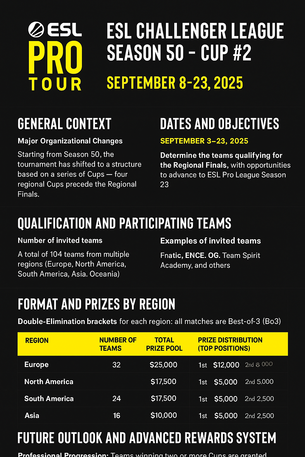 الدفع إلى Pro League: الفائز من كل منطقة يكفل مقعدًا في النهائيات الإقليمية، والفائز من النهائيات ينتقل إلى ESL Pro League Season 23 .